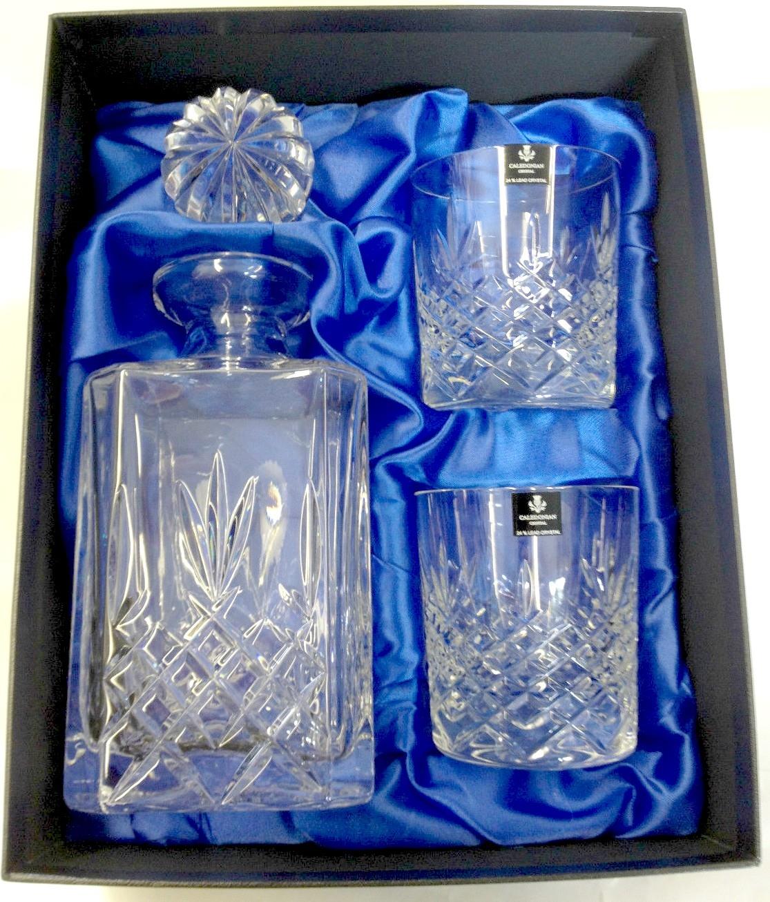 Square Hand Cut Lead Crystal Decanter and Pair of Old Fashioned Whisky Glasses in Silk Lined Presentation Box